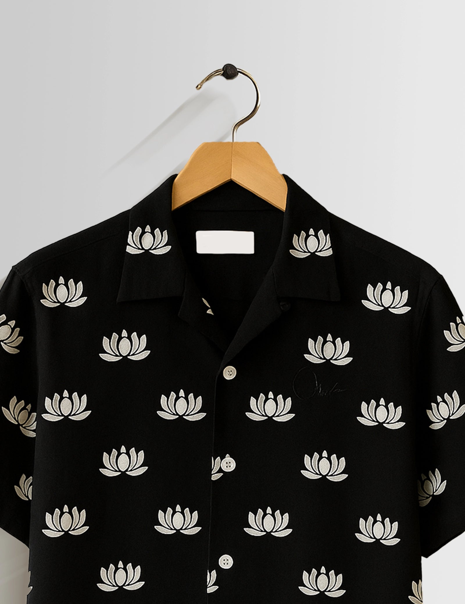 Black Small Lotus Printed Mens Half Sleeves Shirts - XPST
